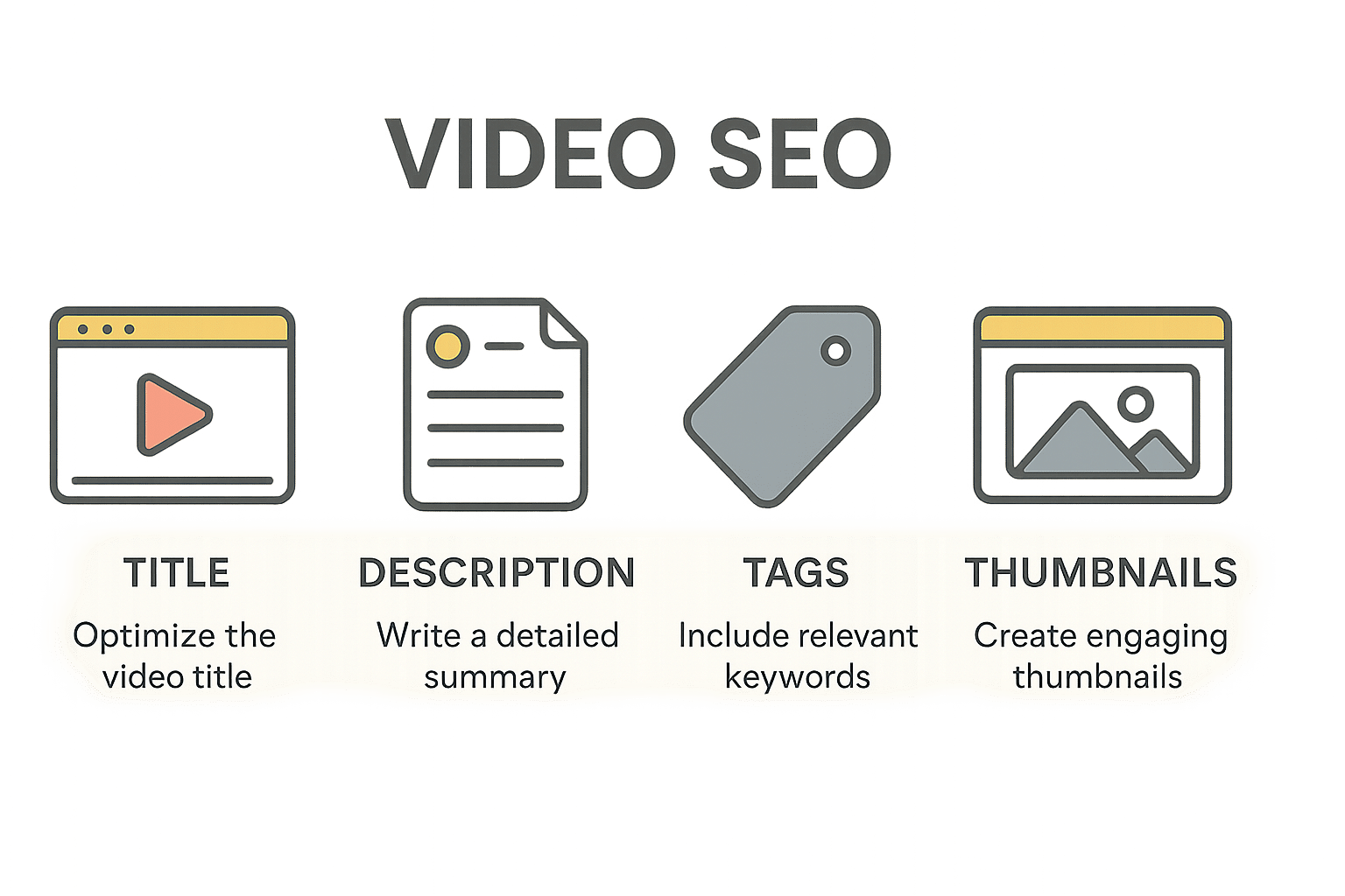 So, how do you ensure your videos are working for you in search results, not just sitting idle on a platform? It starts with the basics, much like optimizing a written piece: